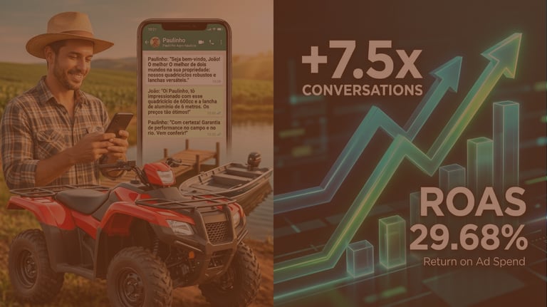 Ao longo do trimestre, houve uma virada clara de eficiência com: redução de ~68% no custo por conversa, aumento de ~7,5x no volume de conversas e ROAS de 29,68% em 3 meses